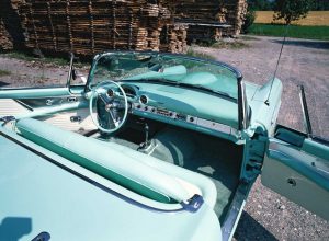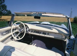 Doch zurück zu 1956: Kleine, sehr dekorative äußere Windleit-Scheiben verfehlten nicht den Effekt, und ähnlich geformte Luftklappen an den Vorderkotflügeln brachten auch dann genügend Frischluft in den Innenraum, wenn schlechtes Wetter oder zu große Hitze ein geschlossenes Verdeck erforderten. Bei Sonnenschein mit geschlossenem Verdeck fahren? Tja, eine typisch amerikanische Eigenart (weshalb es auch so viele Cabrios mit Klimaanlage gibt).